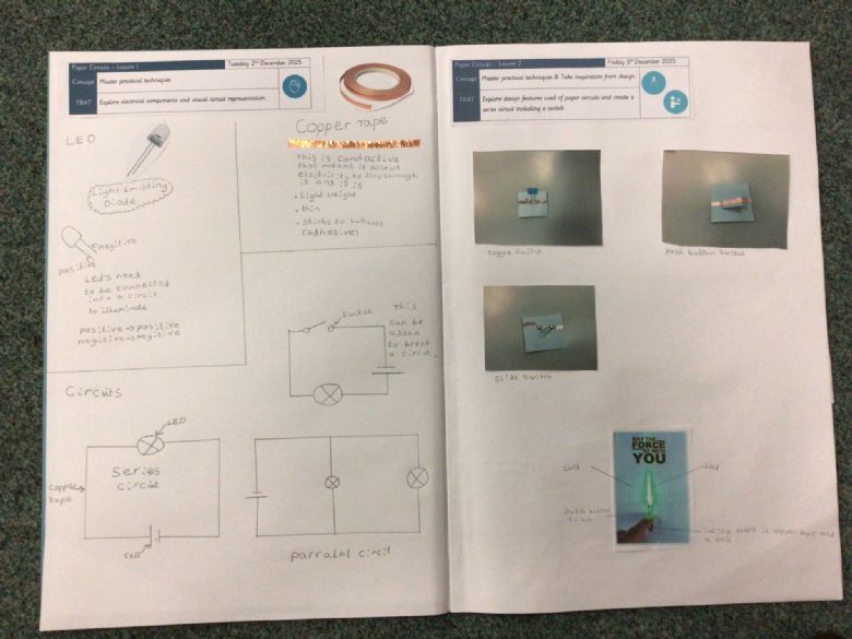 This week, we started our new DT unit linked to our Science topic, Electricity. The children have been tasked to make a paper circuit Christmas card using all of the learning they have built in lessons. We learnt more about LED's and were introduced to copper tape as a conductive, lightweight and adhesive alternative to wires. Later on in the week, we had a go at making switches using copper tape and various items (including paper clips and push button switches) to investigate which would be best for our final products.